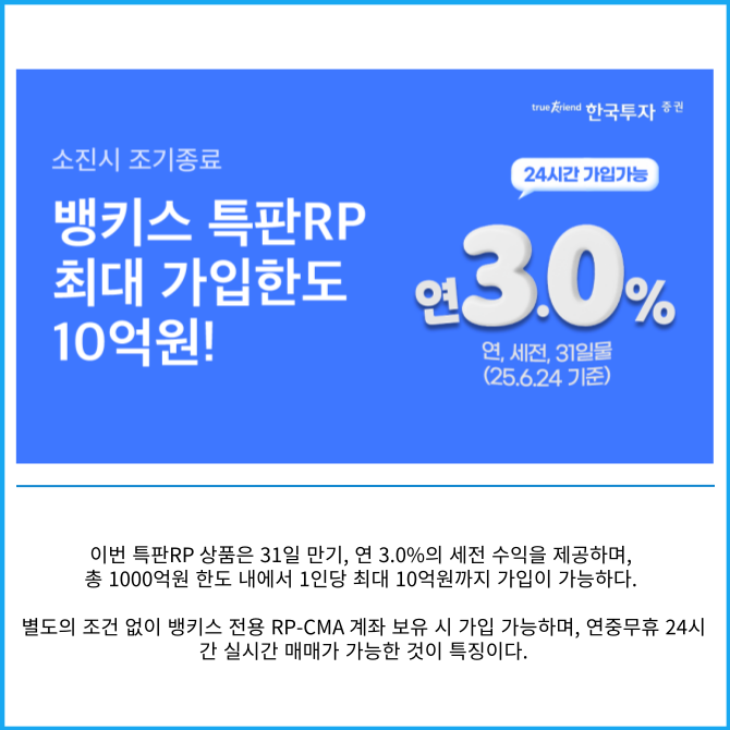 [카드] 한투증권, 뱅키스 특판 RP 판매…365일 24시간