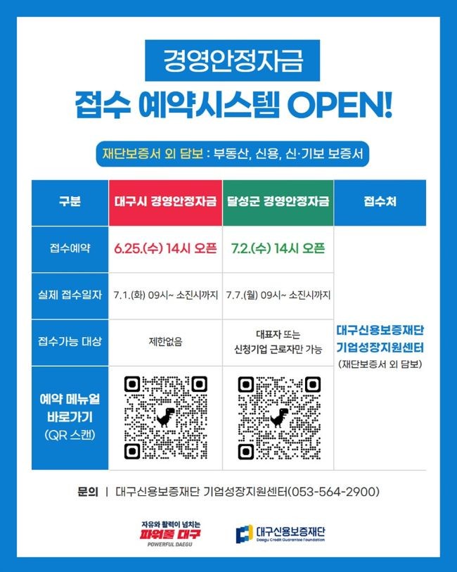 한편, 하반기 대구시 경영안정자금의 사전 예약은 6월25일 오후 2시 오픈(실제 서류접수는 7월1일부터 시작), 달성군 경영안정자금의 사전 예약은 7월2일 오후 2시(실제 서류접수는 7월7일부터 시작)에 오픈할 예정이다.
