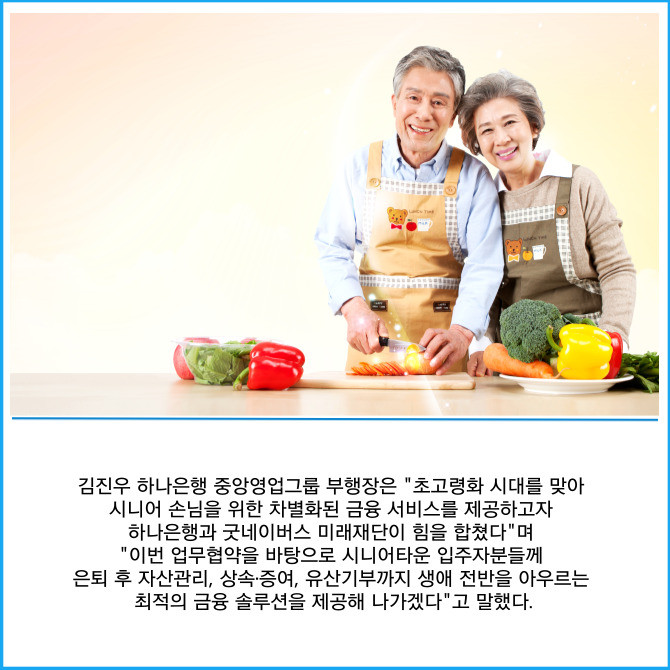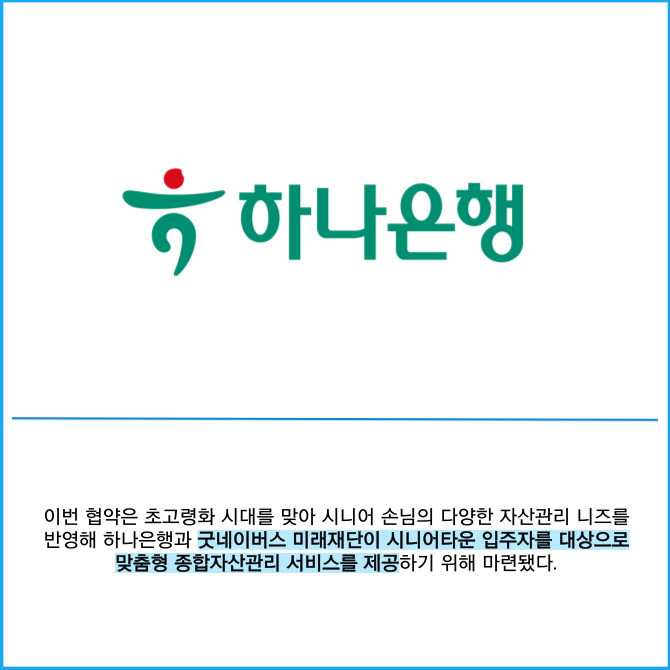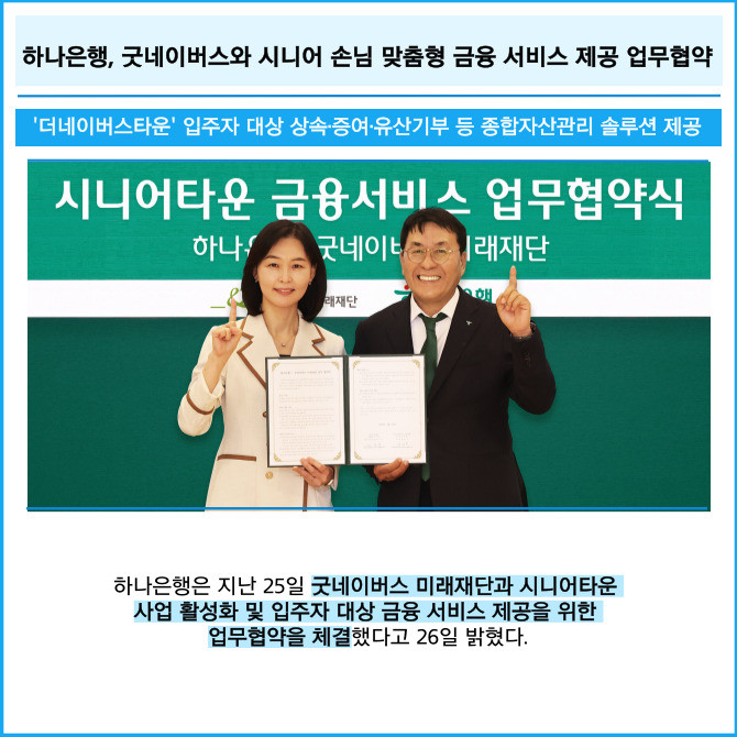 [프라임경제] 하나은행은 지난 25일 굿네이버스 미래재단과 시니어타운 사업 활성화 및 입주자 대상 금융 서비스 제공을 위한 업무협약을 체결했다고 26일 밝혔다.