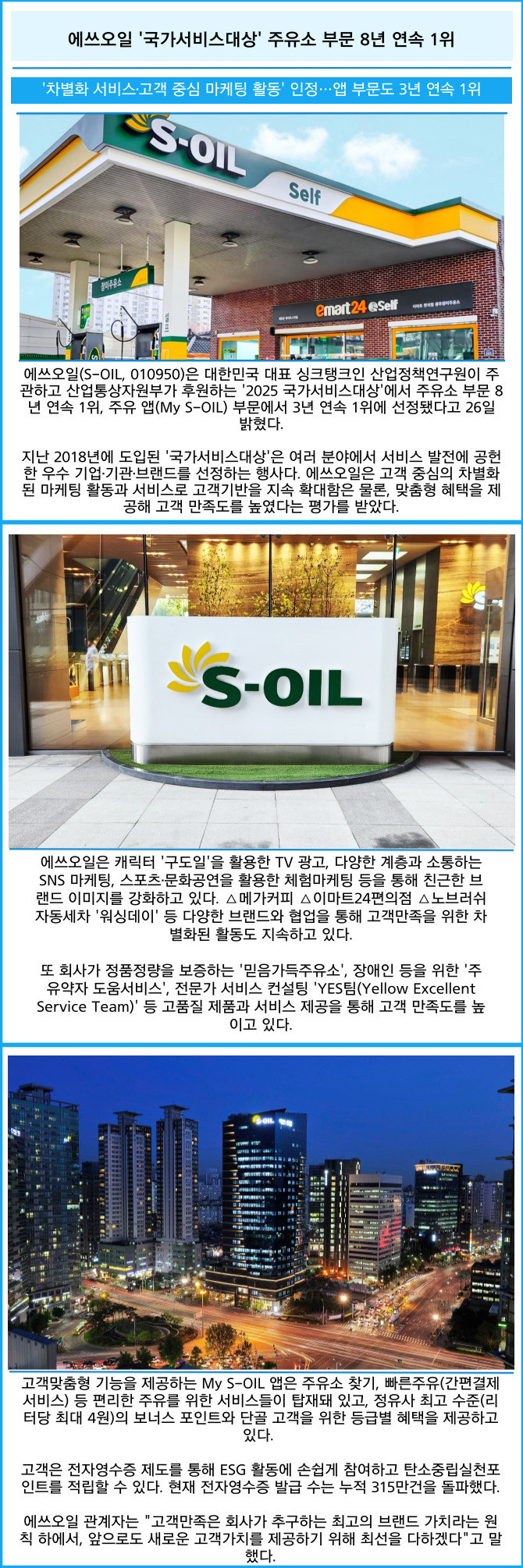 [프라임경제] 에쓰오일(S-OIL, 010950)은 대한민국 대표 싱크탱크인 산업정책연구원이 주관하고 산업통상자원부가 후원하는 '2025 국가서비스대상'에서 주유소 부문 8년 연속 1위, 주유 앱(My S-OIL) 부문에서 3년 연속 1위에 선정됐다고 26일 밝혔다.