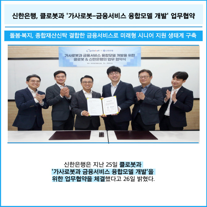 [프라임경제] 신한은행은 지난 25일 클로봇과 '가사로봇과 금융서비스 융합모델 개발'을 위한 업무협약을 체결했다고 26일 밝혔다.