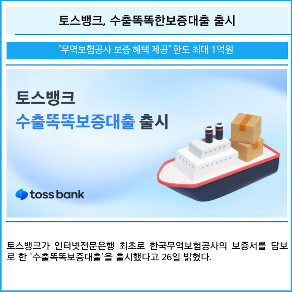 [프라임경제] 토스뱅크가 인터넷전문은행 최초로 한국무역보험공사의 보증서를 담보로 한 '수출똑똑보증대출'을 출시했다고 26일 밝혔다.