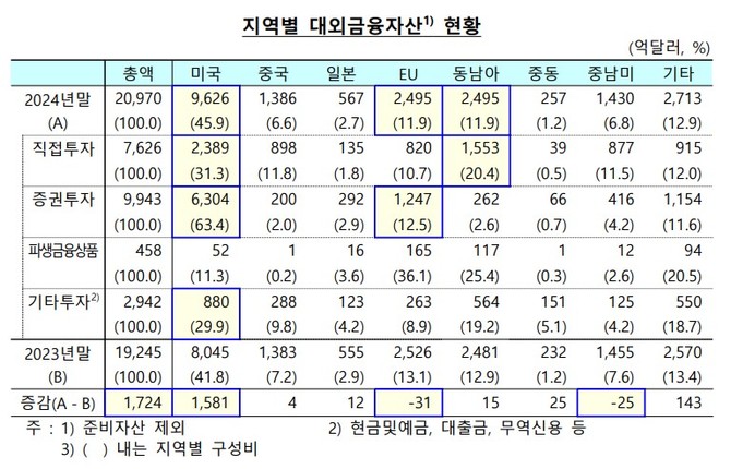 전체 대외금융자산 가운데 미국 자산이 차지하는 비중도 45.9%까지 확대되며 2년 연속 최대치를 경신했다. 뒤이어 △동남아(2495억달러·11.9%) △EU(유럽연합)(2495억달러·11.9%) △중남미(1430억달러·6.8%) △중국(1386억달러·6.6%) 등의 순이다.