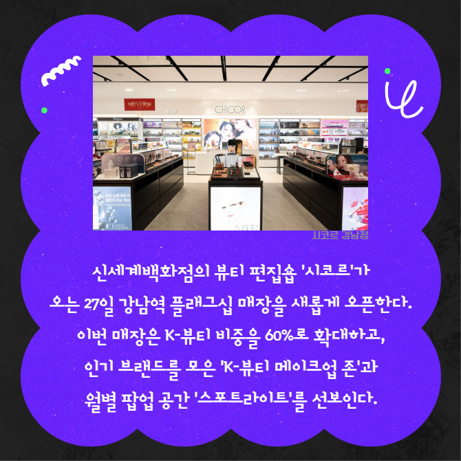 [프라임경제] 신세계백화점의 뷰티 편집숍 '시코르'가 오는 27일 강남역 플래그십 매장을 새롭게 오픈한다. 이번 매장은 K-뷰티 비중을 60%로 확대하고, 인기 브랜드를 모은 'K-뷰티 메이크업 존'과 월별 팝업 공간 '스포트라이트'를 선보인다.