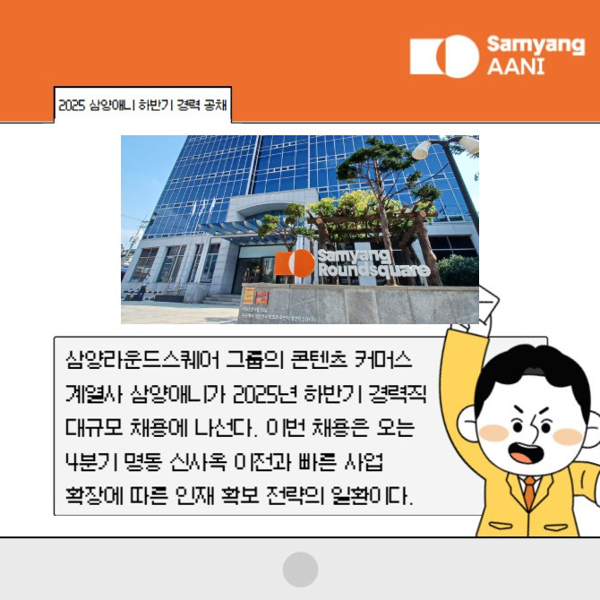 [프라임경제] 삼양라운드스퀘어 그룹의 콘텐츠 커머스 계열사 삼양애니가 2025년 하반기 경력직 대규모 채용에 나선다. 이번 채용은 오는 4분기 명동 신사옥 이전과 빠른 사업 확장에 따른 인재 확보 전략의 일환이다.