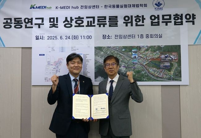[프라임경제] 케이메디허브(대구경북첨단의료산업진흥재단, 이사장 박구선) 전임상센터와 한국동물실험대체법학회가 지난 24일 국제적 수준의 첨단 동물대체시험법 개발 및 연구지원을 위해 업무협약을 체결했다.