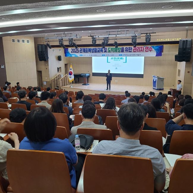 포항교육지원청은 지난 24일 포항교육지원청 여울관에서 관내 초·중·고등학교 교감 130여 명을 대상으로 교육과정과 연계한 관계회복 생활교육 연수를 실시했다.