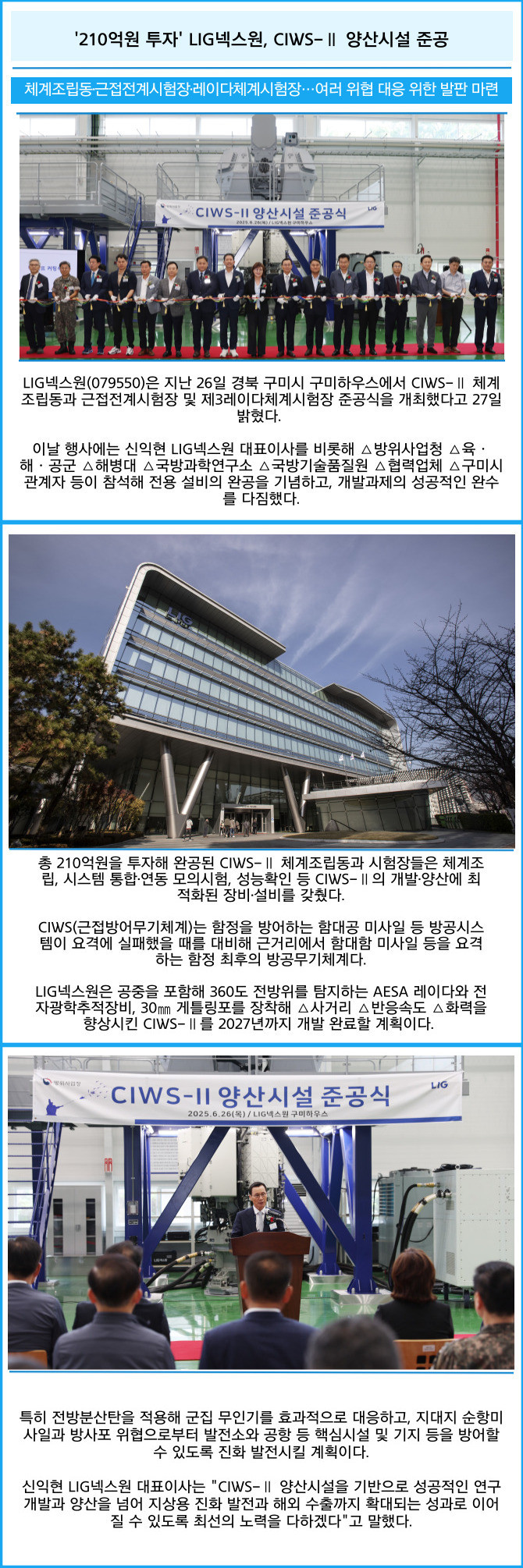 [프라임경제] LIG넥스원(079550)은 지난 26일 경북 구미시 구미하우스에서 CIWS-Ⅱ 체계조립동과 근접전계시험장 및 제3레이다체계시험장 준공식을 개최했다고 27일 밝혔다.