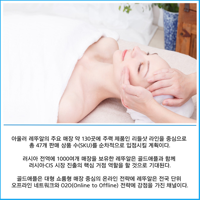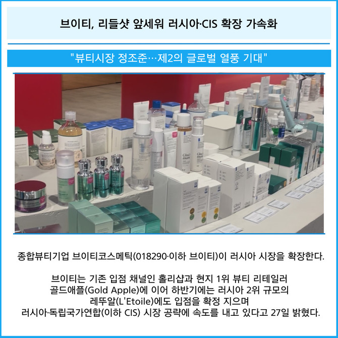 브이티는 기존 입점 채널인 홀리샵과 현지 1위 뷰티 리테일러 골드애플(Gold Apple)에 이어 하반기에는 러시아 2위 규모의 레뚜알(L'Etoile)에도 입점을 확정 지으며 러시아·독립국가연합(이하 CIS) 시장 공략에 속도를 내고 있다고 27일 밝혔다.