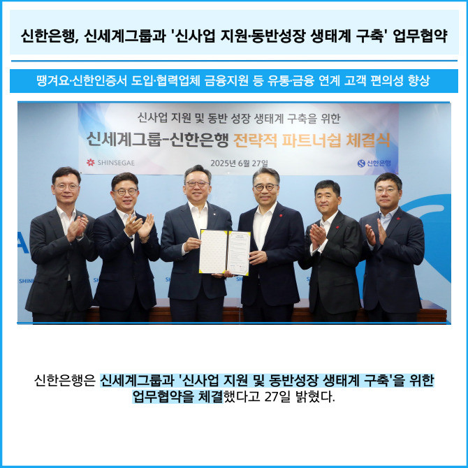 [프라임경제] 신한은행은 신세계그룹과 '신사업 지원 및 동반성장 생태계 구축'을 위한 업무협약을 체결했다고 27일 밝혔다.