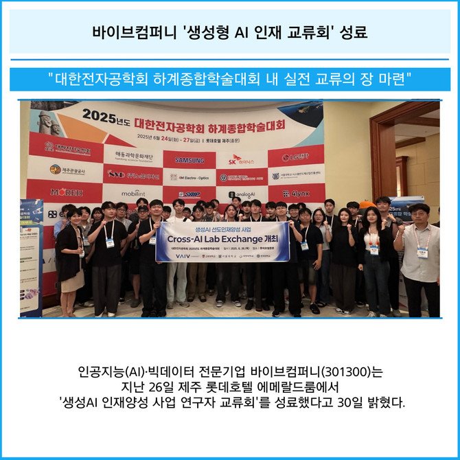 [프라임경제] 인공지능(AI)·빅데이터 전문기업 바이브컴퍼니(301300)는 지난 26일 제주 롯데호텔 에메랄드룸에서 '생성AI 인재양성 사업 연구자 교류회'를 성료했다고 30일 밝혔다.