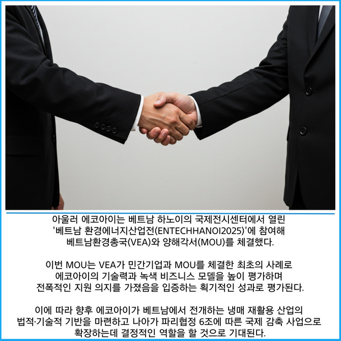 [프라임경제] 친환경 온실가스 감축 선도기업 에코아이(448280)는 베트남과 말레이시아에서 추진하는 '냉매 회수·재활용 사업'에서 성공적인 결과로 아세안 시장의 재생냉매 기반 탄소중립 전환을 선도할 수 있게 됐다고 30일 밝혔다.