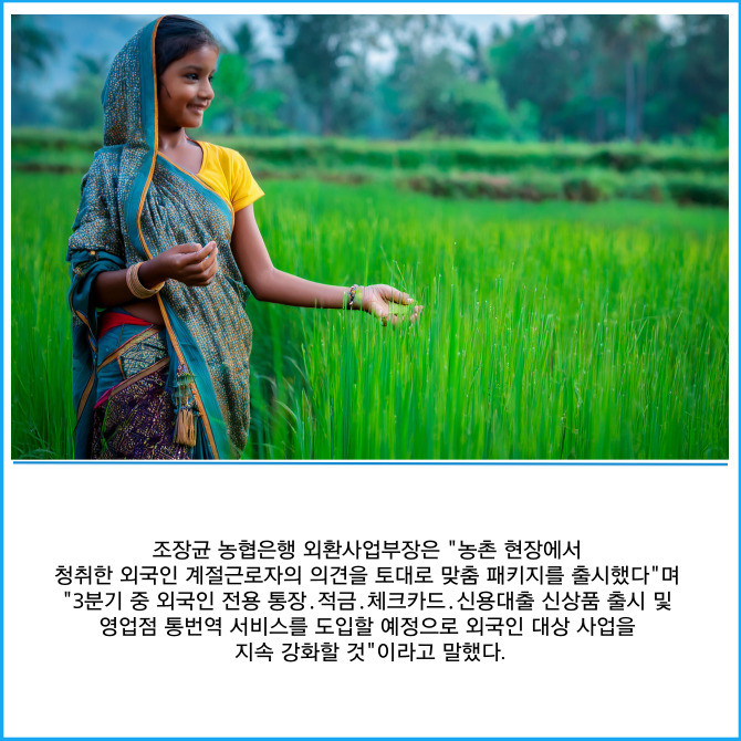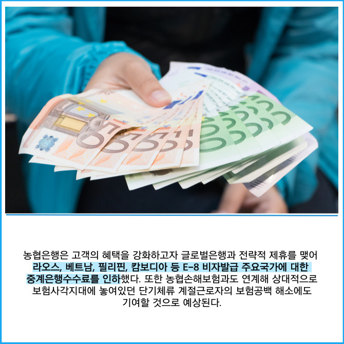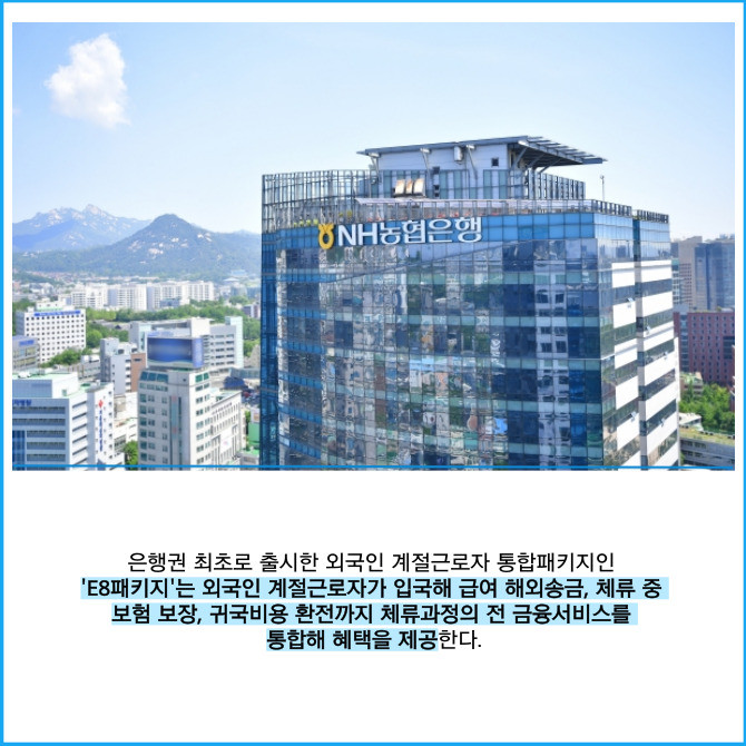 [프라임경제] NH농협은행은 외국인 고객 전용 브랜드 'NH글로벌위드'의 첫 서비스로 우리 농가의 외국인 계절근로자(E-8비자)를 위한 'E8패키지'를 출시했다고 30일 밝혔다.