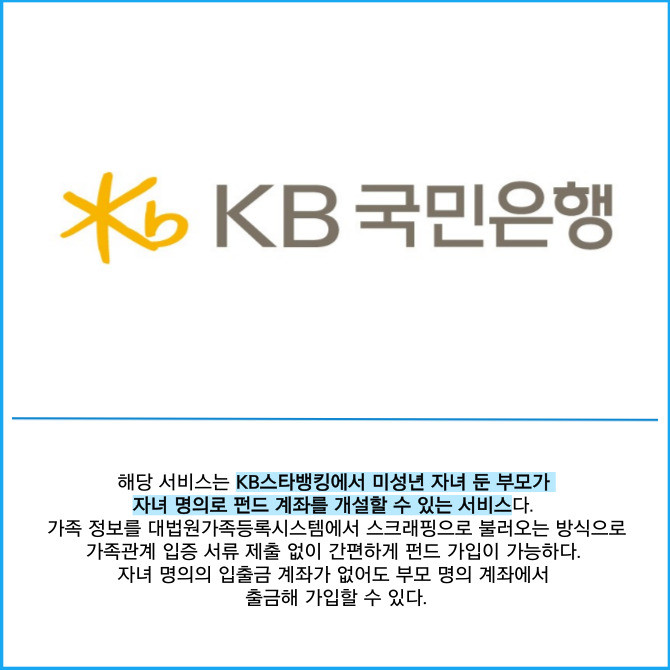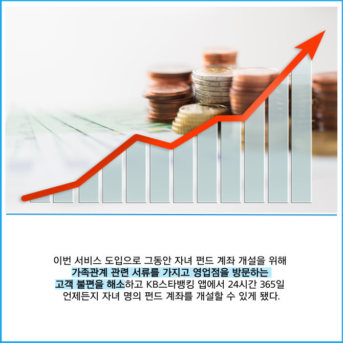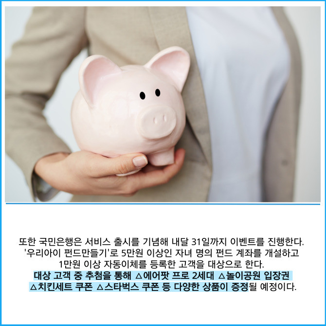 [프라임경제] KB국민은행은 비대면으로 간편하게 미성년 자녀의 펀드 상품을 가입할 수 있는 ‘우리아이 펀드만들기’를 새롭게 선보였다고 30일 밝혔다.
