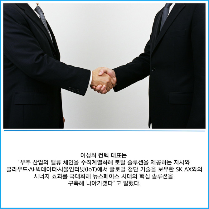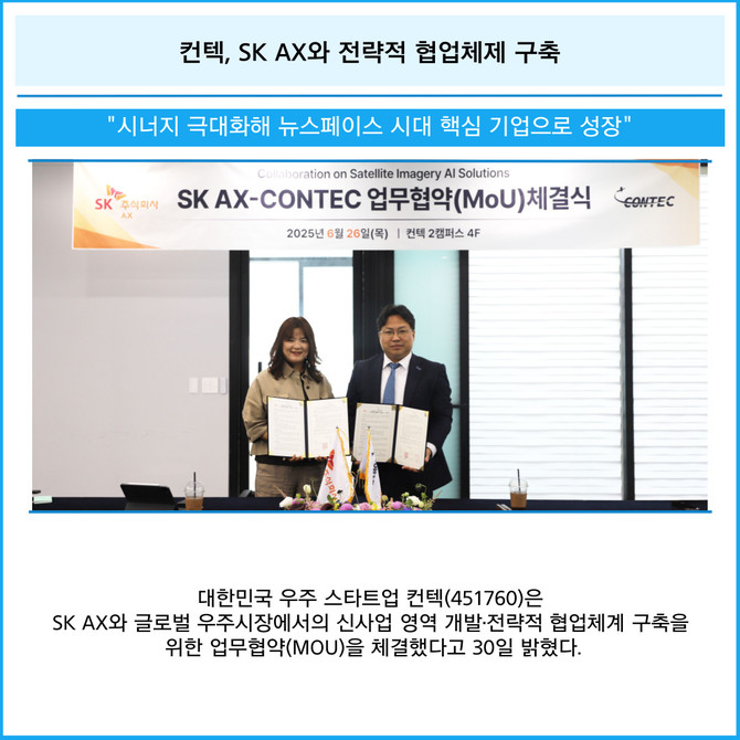 [프라임경제] 대한민국 우주 스타트업 컨텍(451760)은 SK AX와 글로벌 우주시장에서의 신사업 영역 개발·전략적 협업체계 구축을 위한 업무협약(MOU)을 체결했다고 30일 밝혔다.