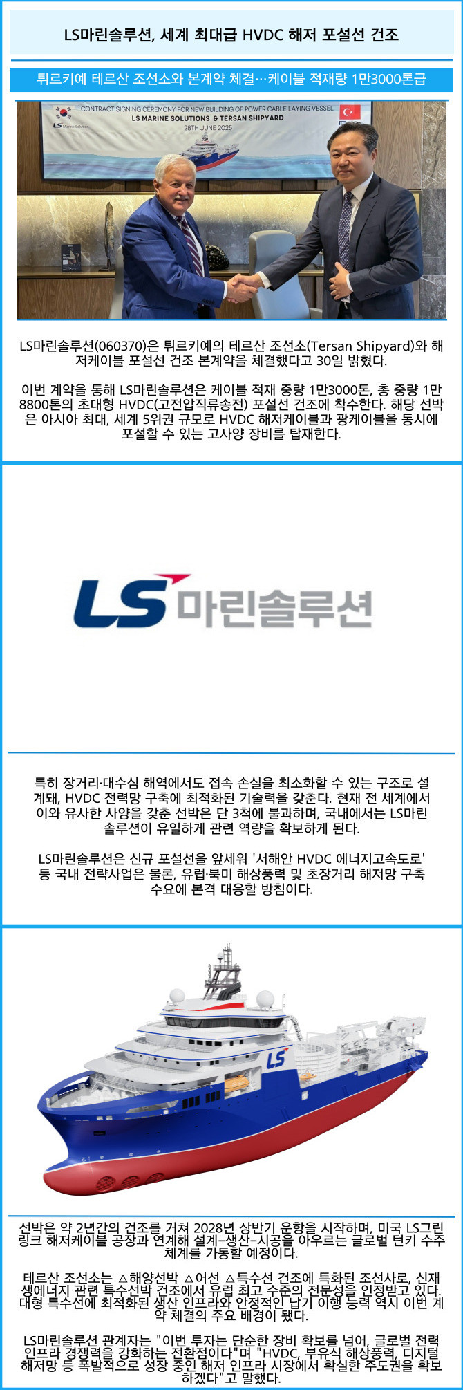 [프라임경제] LS마린솔루션(060370)은 튀르키예의 테르산 조선소(Tersan Shipyard)와 해저케이블 포설선 건조 본계약을 체결했다고 30일 밝혔다.