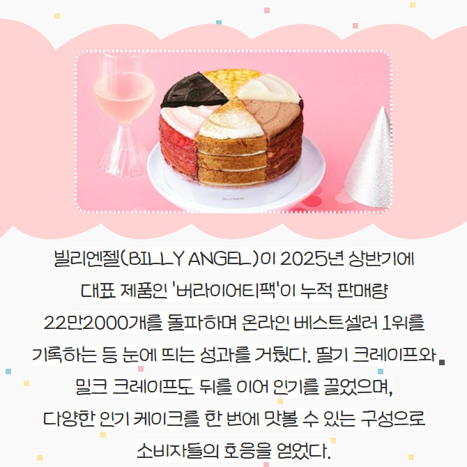 [프라임경제] 빌리엔젤(BILLY ANGEL)이 2025년 상반기에 대표 제품인 '버라이어티팩'이 누적 판매량 22만2000개를 돌파하며 온라인 베스트셀러 1위를 기록하는 등 눈에 띄는 성과를 거뒀다.