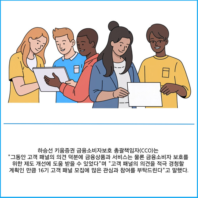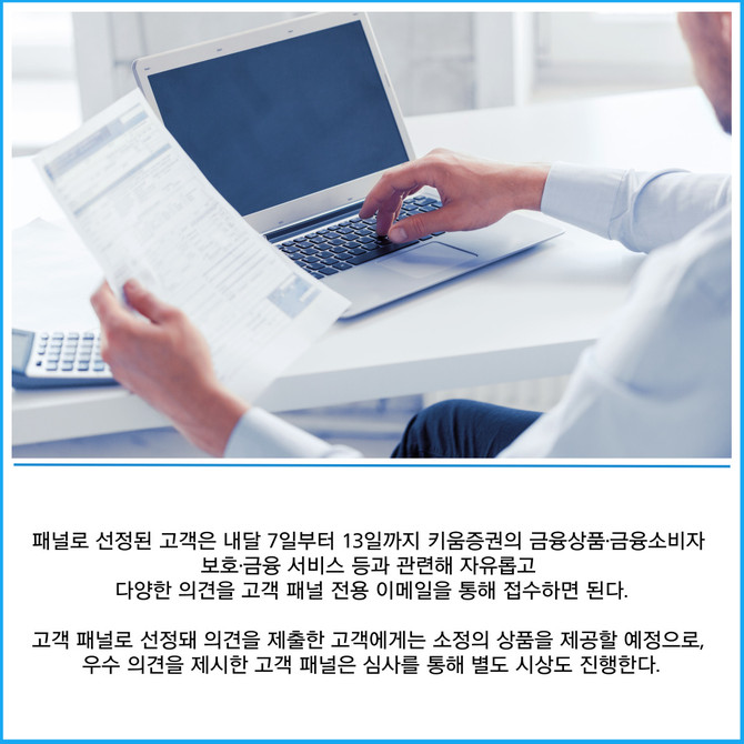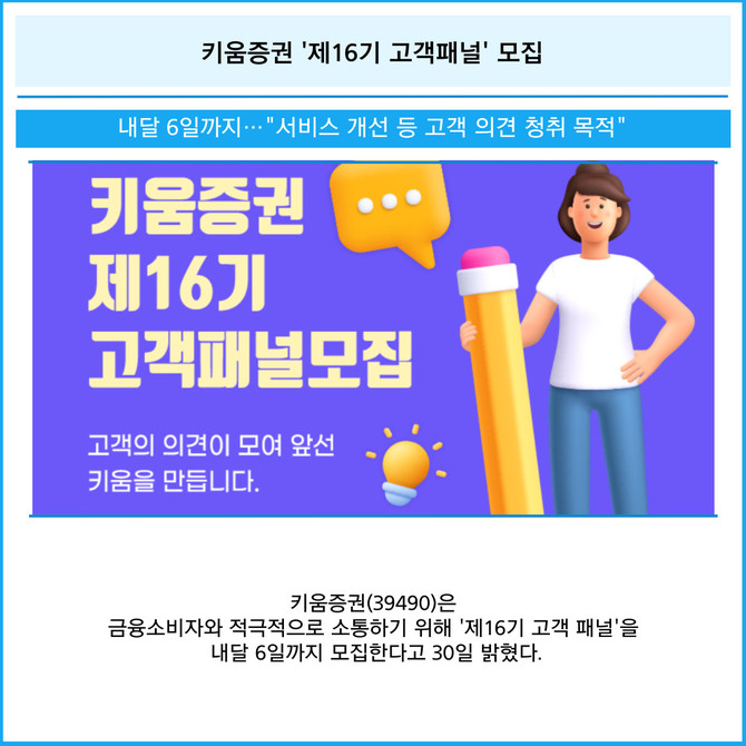 [프라임경제] 키움증권(39490)은 금융소비자와 적극적으로 소통하기 위해 '제16기 고객 패널'을 내달 6일까지 모집한다고 30일 밝혔다.