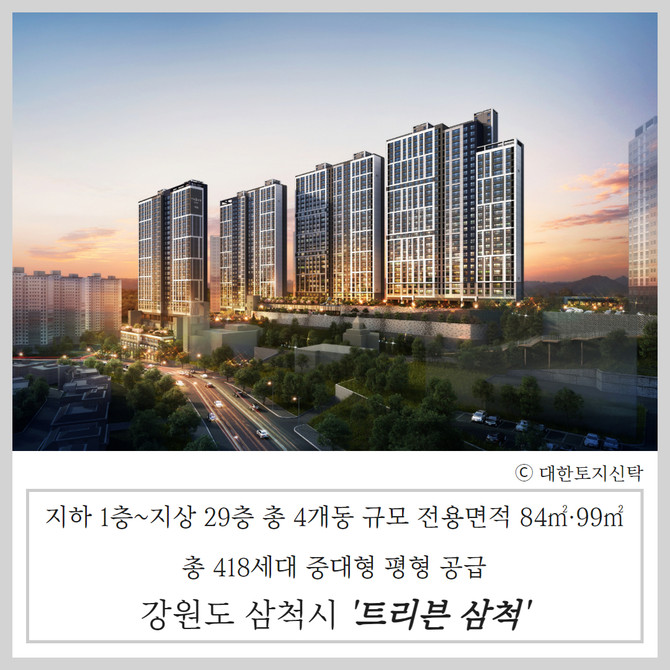 강원도 삼척시에서는 대한토지신탁이 오는 7월 '트리븐 삼척'을 공급할 예정이다. 삼척시의 노후주택 비율은 68.3%로 도내에서도 높은 수준이다.