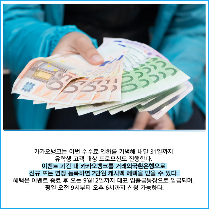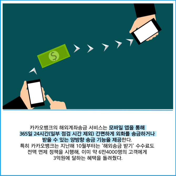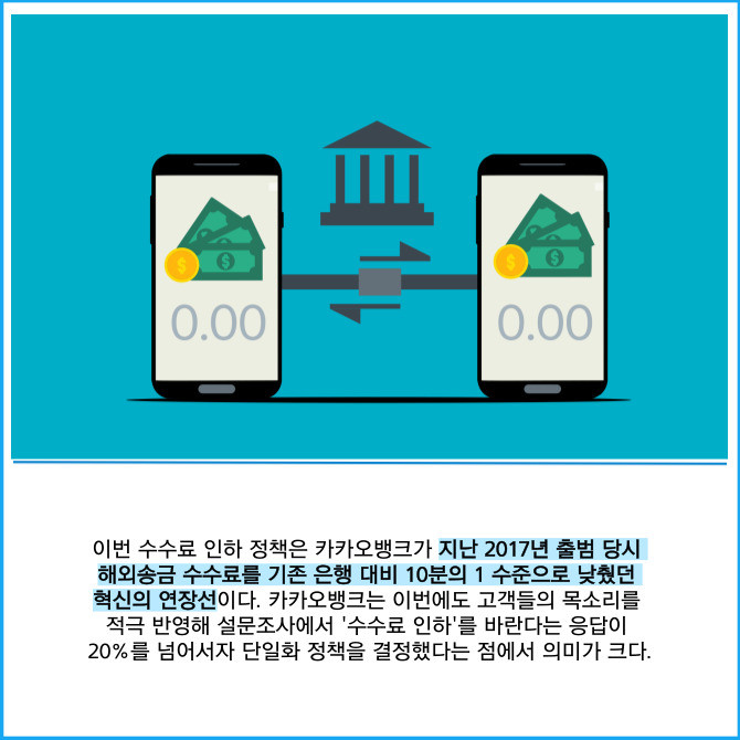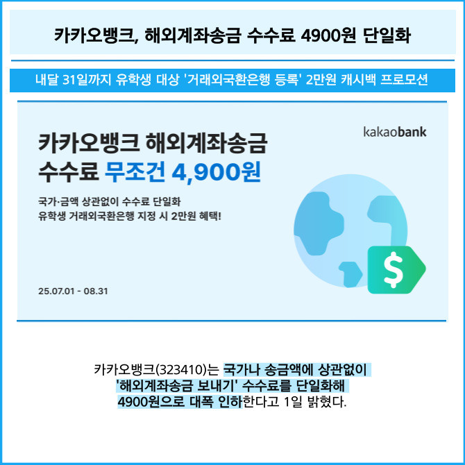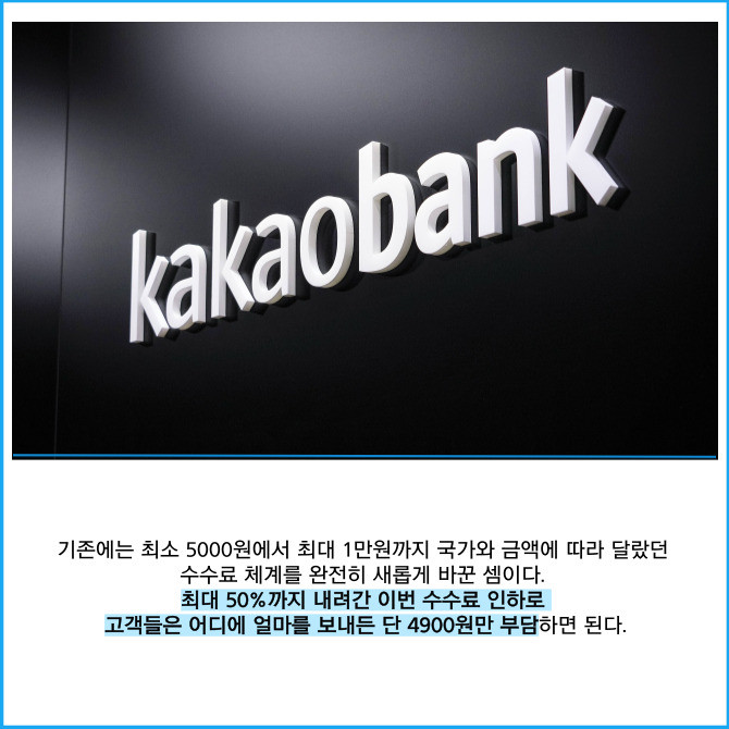 [프라임경제] 카카오뱅크(323410)는 국가나 송금액에 상관없이 '해외계좌송금 보내기' 수수료를 단일화해 4900원으로 대폭 인하한다고 1일 밝혔다.