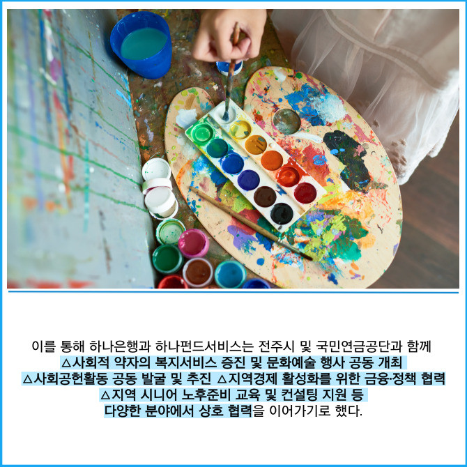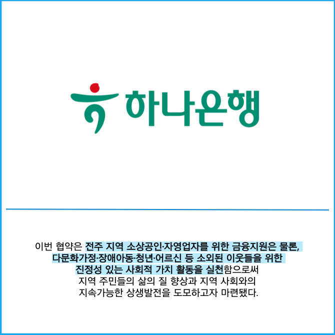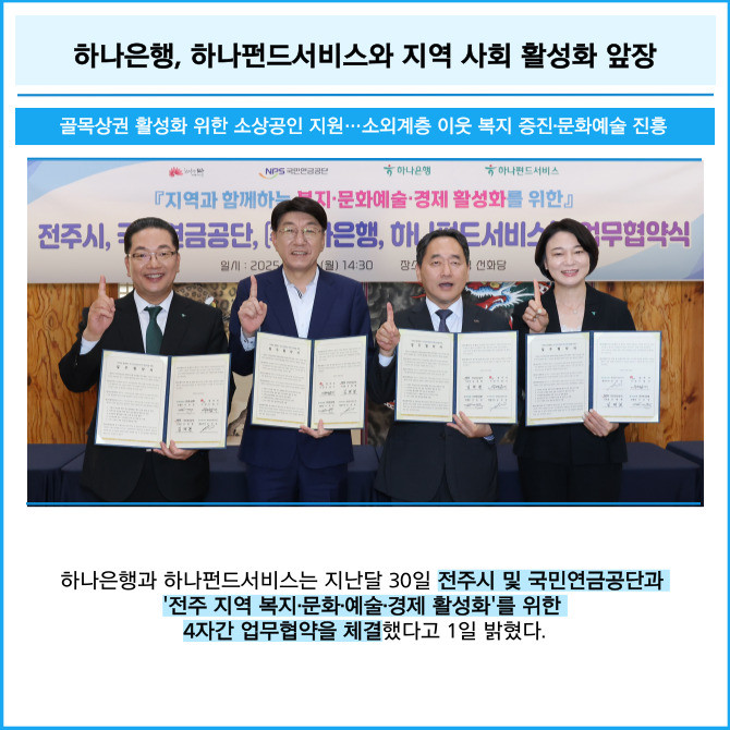 [프라임경제] 하나은행과 하나펀드서비스는 지난달 30일 전주시 및 국민연금공단과 '전주 지역 복지·문화·예술·경제 활성화'를 위한 4자간 업무협약을 체결했다고 1일 밝혔다.
