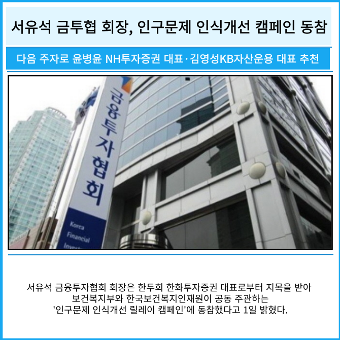 [프라임경제] 서유석 금융투자협회 회장은 한두희 한화투자증권 대표로부터 지목을 받아 보건복지부와 한국보건복지인재원이 공동 주관하는'인구문제 인식개선 릴레이 캠페인'에 동참했다고 1일 밝혔다.