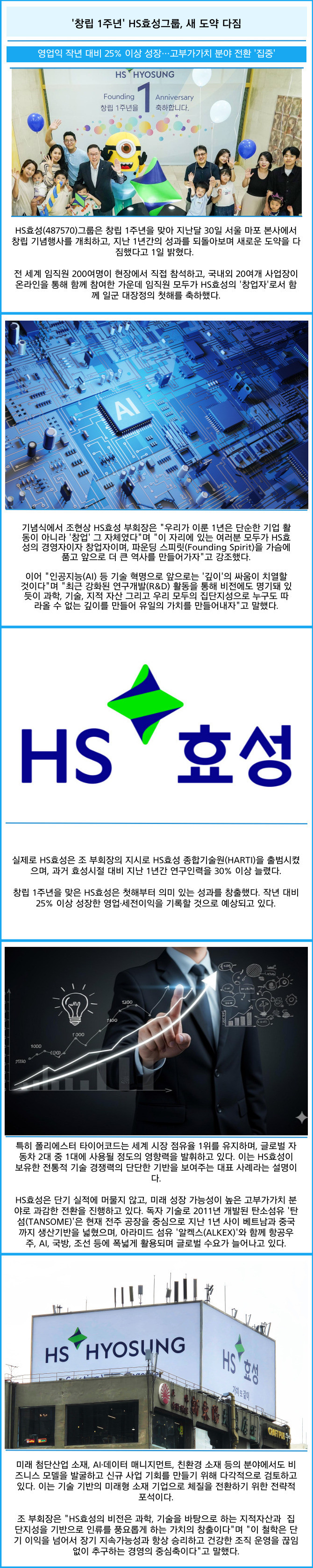 [프라임경제] HS효성(487570)그룹은 창립 1주년을 맞아 지난달 30일 서울 마포 본사에서 창립 기념행사를 개최하고, 지난 1년간의 성과를 되돌아보며 새로운 도약을 다짐했다고 1일 밝혔다.