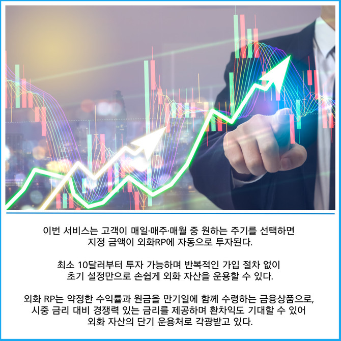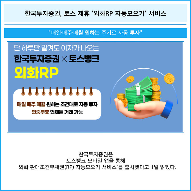 [프라임경제] 한국투자증권은 토스뱅크 모바일 앱을 통해 '외화 환매조건부채권(RP) 자동모으기 서비스'를 출시했다고 1일 밝혔다.