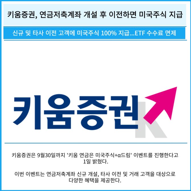 [프라임경제] 키움증권은 9월30일까지 '키움 연금은 미국주식+α드림' 이벤트를 진행한다고 1일 밝혔다.