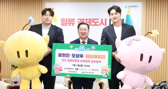 대전시는 1일 시청에서 메이저리거 류현진 선수(한화이글스 소속), 펜싱 국가대표 오상욱 선수, 대전관광공사, 대전디자인진흥원과 함께 '류현진·오상욱·꿈씨패밀리 콜라보 굿즈 공동브랜딩' 업무협약(MOU)을 체결했다.