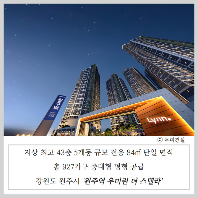 원주에서는 오는 8월 우미건설 남원주역세권 AC-5블록에 '원주역 우미린 더 스텔라'를 분양한다. 단지는 지상 최고 43층, 5개 동, 총 927가구 규모다. 전 가구는 전용 84㎡ 단일 면적이다. 앞서 분양된 '원주역 우미린 더 스카이'(900가구)와 함께 총 1827가구 규모 브랜드 타운을 이룰 예정이다.
