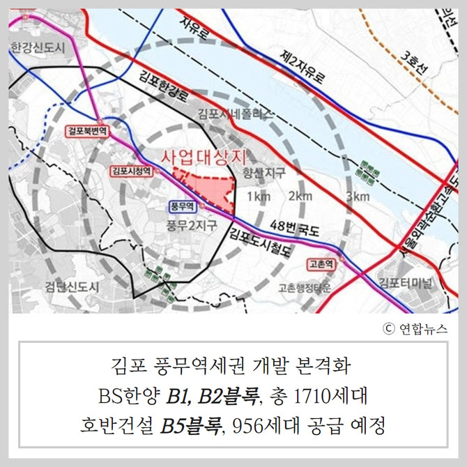 김포 풍무역세권 개발도 본격화한다. BS한양은 B1, B2블록에서 총 1710가구를, 호반건설은 B5블록에서 956가구를 공급할 계획이다.
