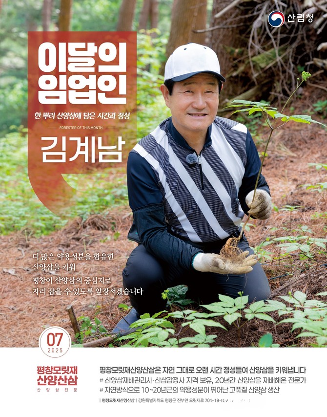 [프라임경제] 산림청(청장 임상섭)은 '이 달의 임업인'으로 강원특별자치도 평창군에서 산양삼을 재배하는 평창모릿재산양산삼 김계남(72세) 대표를 선정했다고 1일 밝혔다.