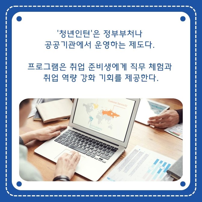 '청년인턴'은 정부부처나 공공기관에서 운영하는 제도다. 프로그램은 취업 준비생에게 직무 체험과 취업 역량 강화 기회를 제공한다.