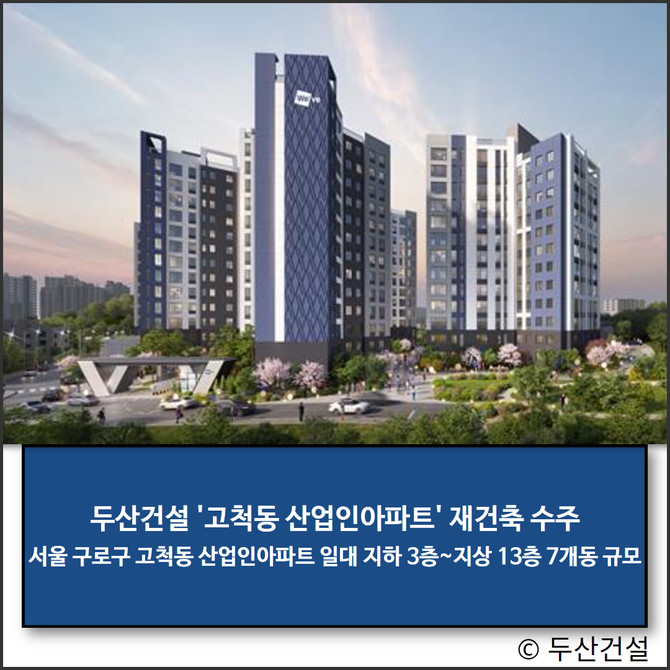'산업인아파트 재건축 정비사업'은 서울 구로구 고척동 산업인아파트 일대에 지하 3층~지상 13층 7개동 규모로 아파트 367세대 및 부대복리시설을 새롭게 조성하는 사업이다. 공사 기간은 착공일로부터 33개월이며, 공사비는 약 1363억원(VAT 별도)이다.