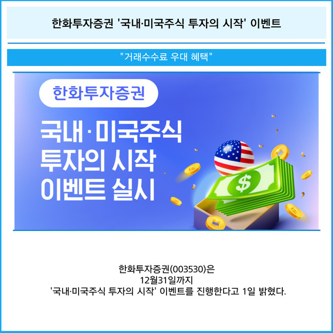 [프라임경제] 한화투자증권(003530)은 12월31일까지 '국내·미국주식 투자의 시작' 이벤트를 진행한다고 1일 밝혔다.