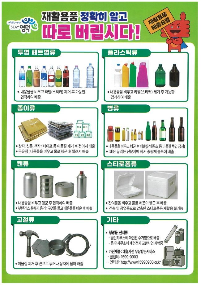 영덕군은 올바른 재활용품 분리배출 문화를 확산하고 현장에서 자주 발생하는 혼합 배출과 오인 배출 사례를 줄이기 위해 '재활용품 분리배출 안내 리플릿'을 제작해 배포한다.