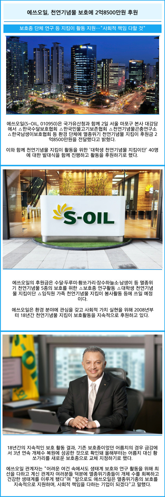 [프라임경제] 에쓰오일(S-OIL, 010950)은 국가유산청과 함께 2일 서울 마포구 본사 대강당에서 △한국수달보호협회 △한국민물고기보존협회 △천연기념물곤충연구소 △한국남생이보호협회 등 환경 단체에 멸종위기 천연기념물 지킴이 후원금 2억8500만원을 전달했다고 밝혔다.