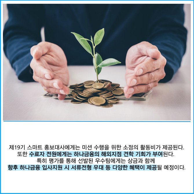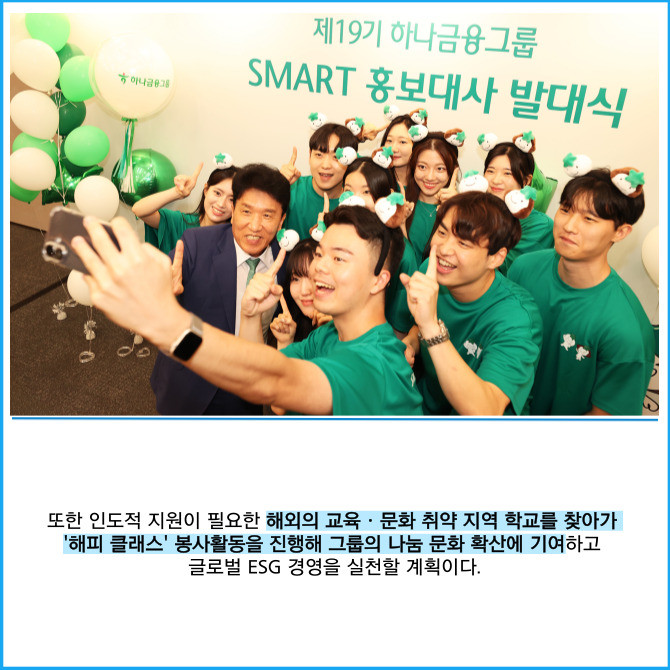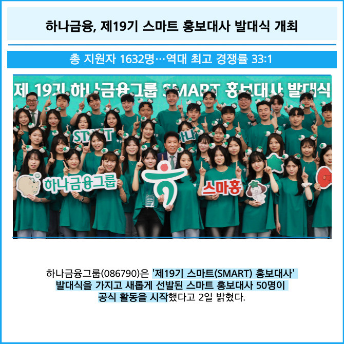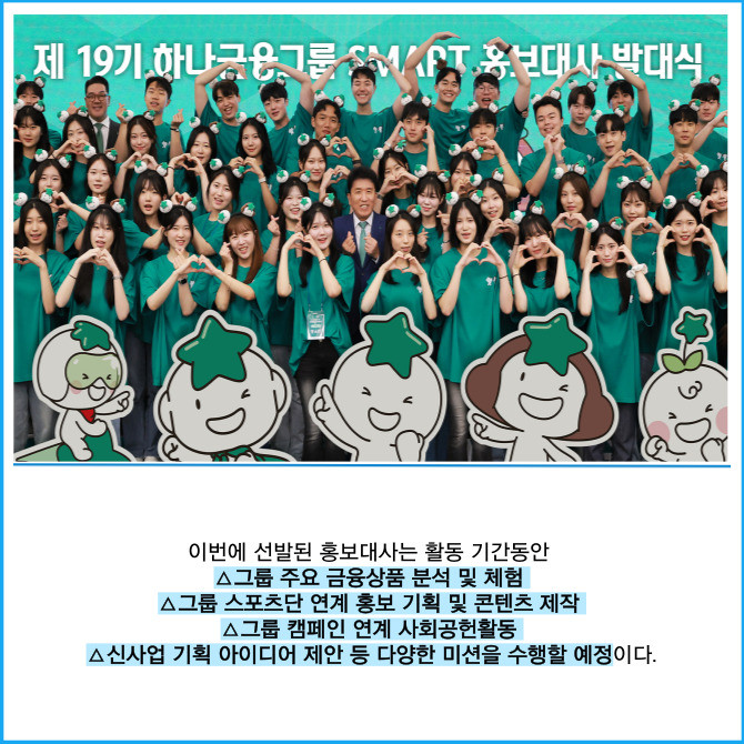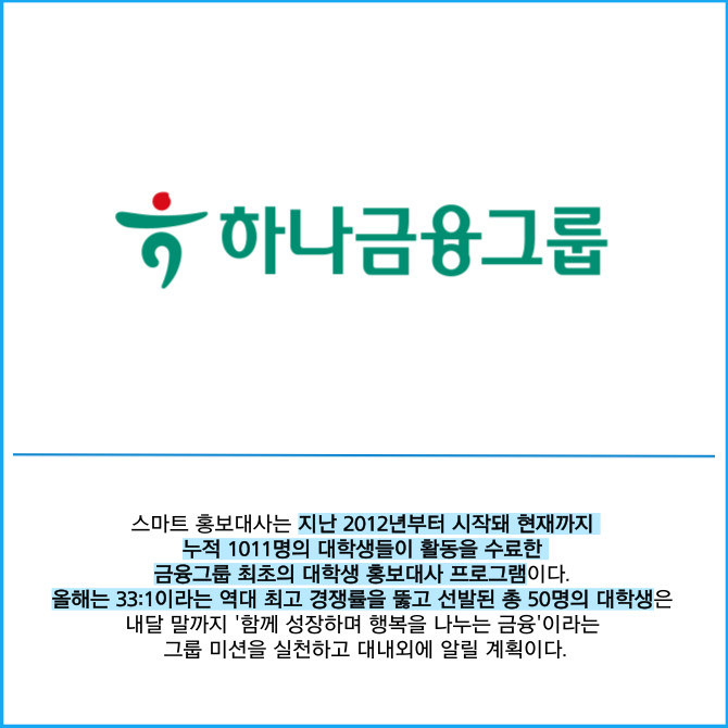 [프라임경제] 하나금융그룹(086790)은 '제19기 스마트(SMART) 홍보대사' 발대식을 가지고 새롭게 선발된 스마트 홍보대사 50명이 공식 활동을 시작했다고 2일 밝혔다.