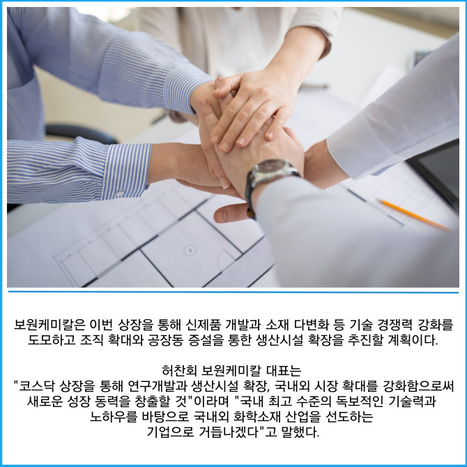 [프라임경제] 화학소재 토탈 솔루션 기업 보원케미칼은 BNK투자증권을 주관사로 선정하고 코스닥 시장 상장을 본격 추진한다고 2일 밝혔다.
