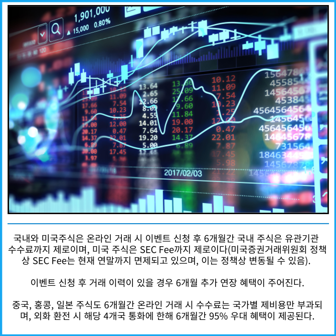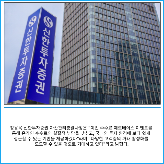 [프라임경제] 신한투자증권은 7월부터 6개월(25.07.01~25.12.31) 동안 '국내주식도! 미국주식도! 온라인 거래수수료 제로베이스 이벤트'를 시행한다고 2일 밝혔다.
