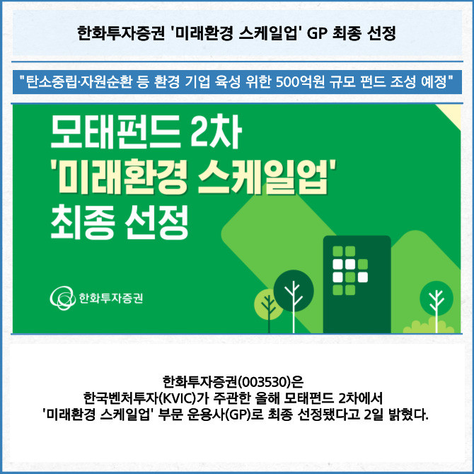 [프라임경제] 한화투자증권(003530)은 한국벤처투자(KVIC)가 주관한 올해 모태펀드 2차에서 '미래환경 스케일업' 부문 운용사(GP)로 최종 선정됐다고 2일 밝혔다.