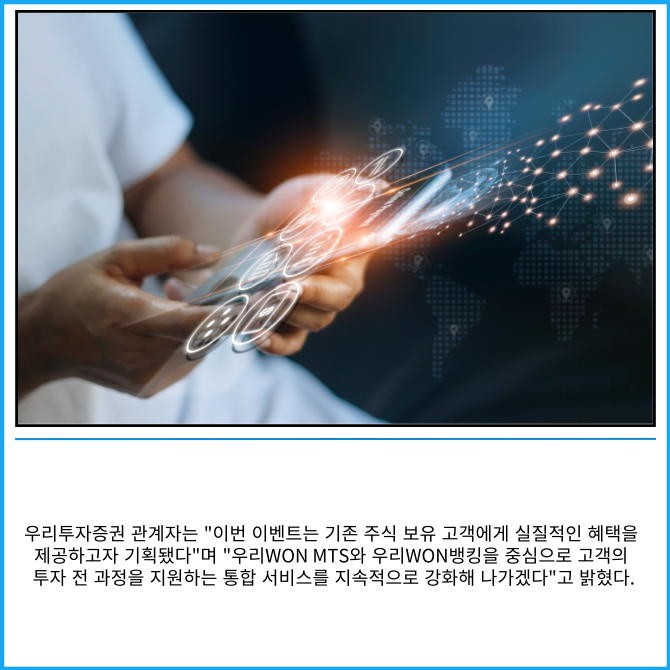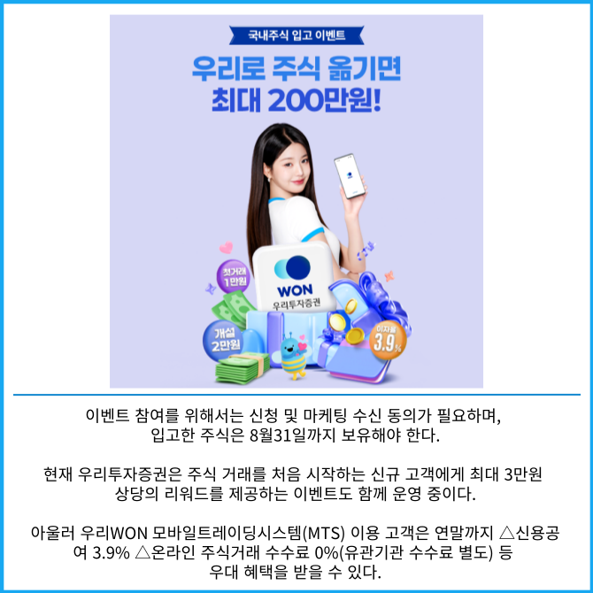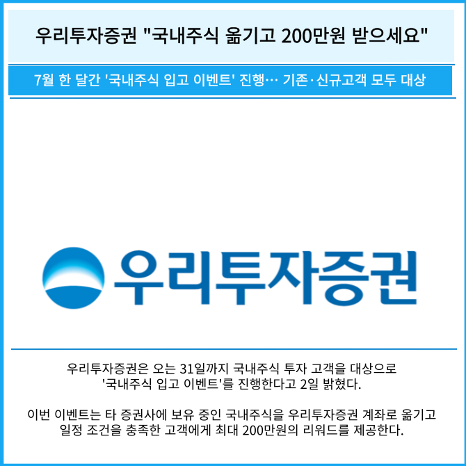 이번 이벤트는 타 증권사에 보유 중인 국내주식을 우리투자증권 계좌로 옮기고 일정 조건을 충족한 고객에게 최대 200만원의 리워드를 제공한다.