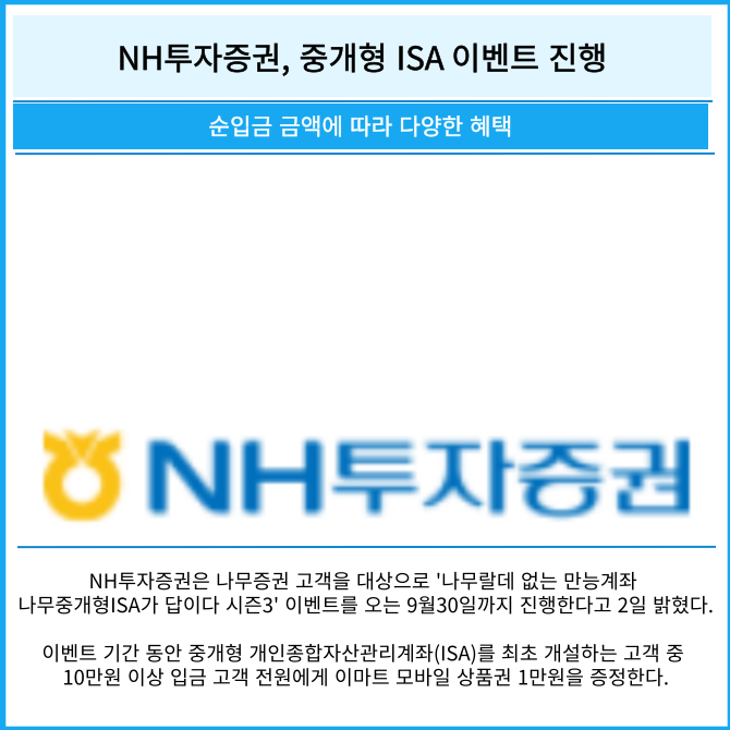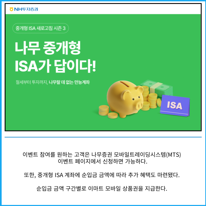 이벤트 기간 동안 중개형 개인종합자산관리계좌(ISA)를 최초 개설하는 고객 중 10만원 이상 입금 고객 전원에게 이마트 모바일 상품권 1만원을 증정한다.