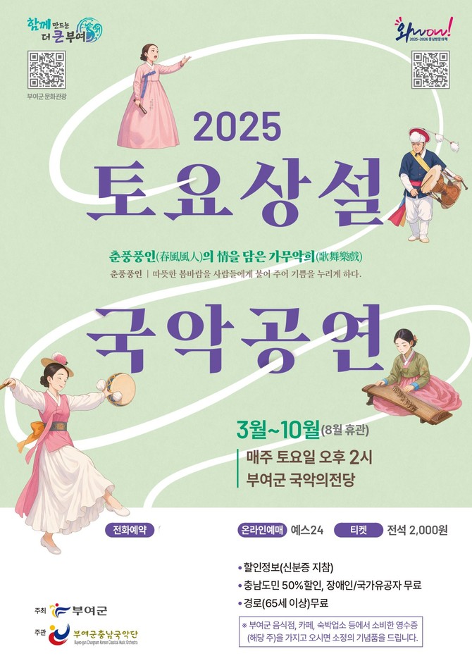 부여군과 부여군충남국악단이 주최하는 '2025 토요상설 국악공연'이 3월부터 10월까지 매주 토요일 오후 2시에 부여군 국악의전당에서 개최된다.