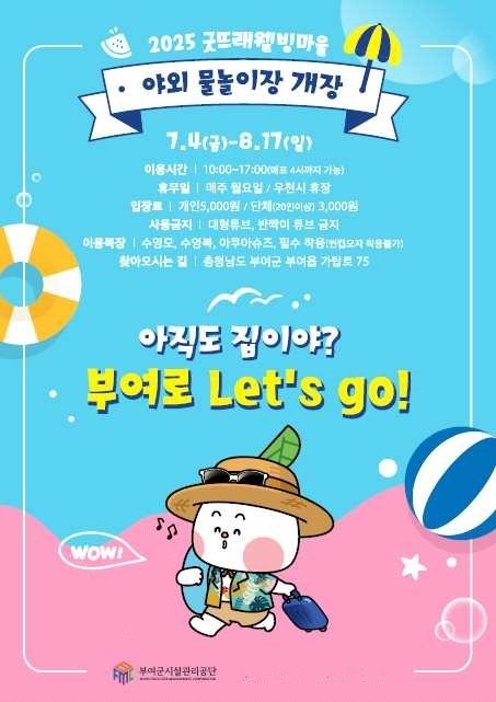 부여군시설관리공단(이사장 윤상철)은 굿뜨래웰빙마을 야외 물놀이장을 오는 7월4일부터 8월17일까지 운영한다. 무더운 여름철 지역 주민과 어린이에게 안전하고 쾌적한 물놀이 환경 제공을 위해서다.