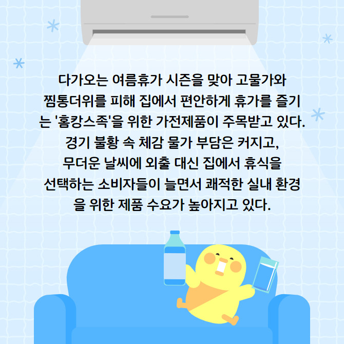 [프라임경제] 다가오는 여름휴가 시즌을 맞아 고물가와 찜통더위를 피해 집에서 편안하게 휴가를 즐기는 '홈캉스족'을 위한 가전제품이 주목받고 있다. 경기 불황 속 체감 물가 부담은 커지고, 무더운 날씨에 외출 대신 집에서 휴식을 선택하는 소비자들이 늘면서 쾌적한 실내 환경을 위한 제품 수요가 높아지고 있다.