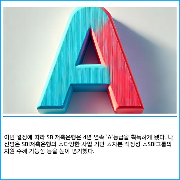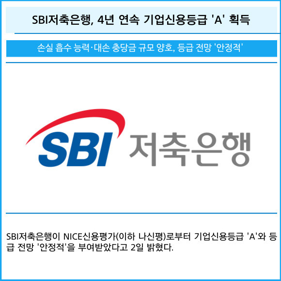 [프라임경제] SBI저축은행이 NICE신용평가(이하 나신평)로부터 기업신용등급 'A'와 등급 전망 '안정적'을 부여받았다고 2일 밝혔다.