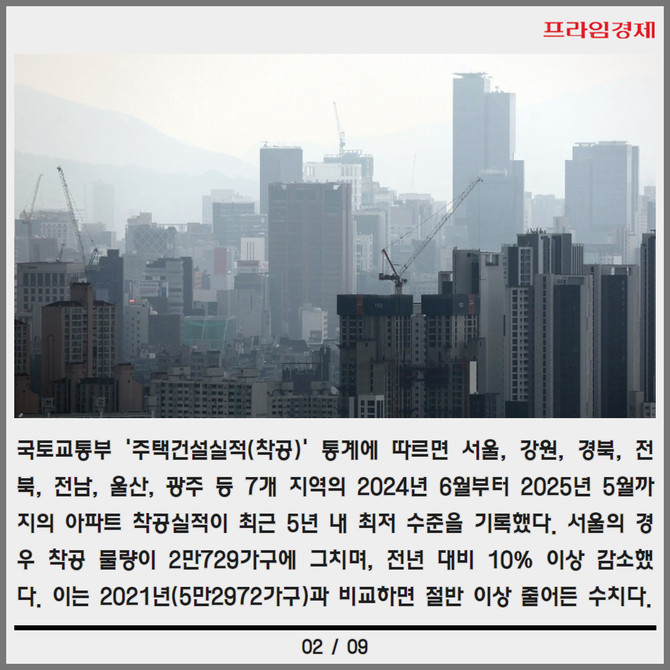 [프라임경제] 최근 1년간 서울을 포함한 7개 광역지자체의 아파트 착공실적이 최근 5년 중 가장 낮은 수준을 기록한 것으로 나타났다.