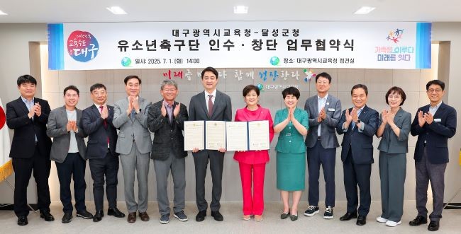 달성군(군수 최재훈)은 지난 1일 대구시교육청 접견실에서 대구시교육청(교육감 강은희)과 '달성군청 유소년축구단' 창단을 위한 협약을 체결하고, 지역 유소년 체육 활성화에 본격적으로 나설 예정이라고 밝혔다.